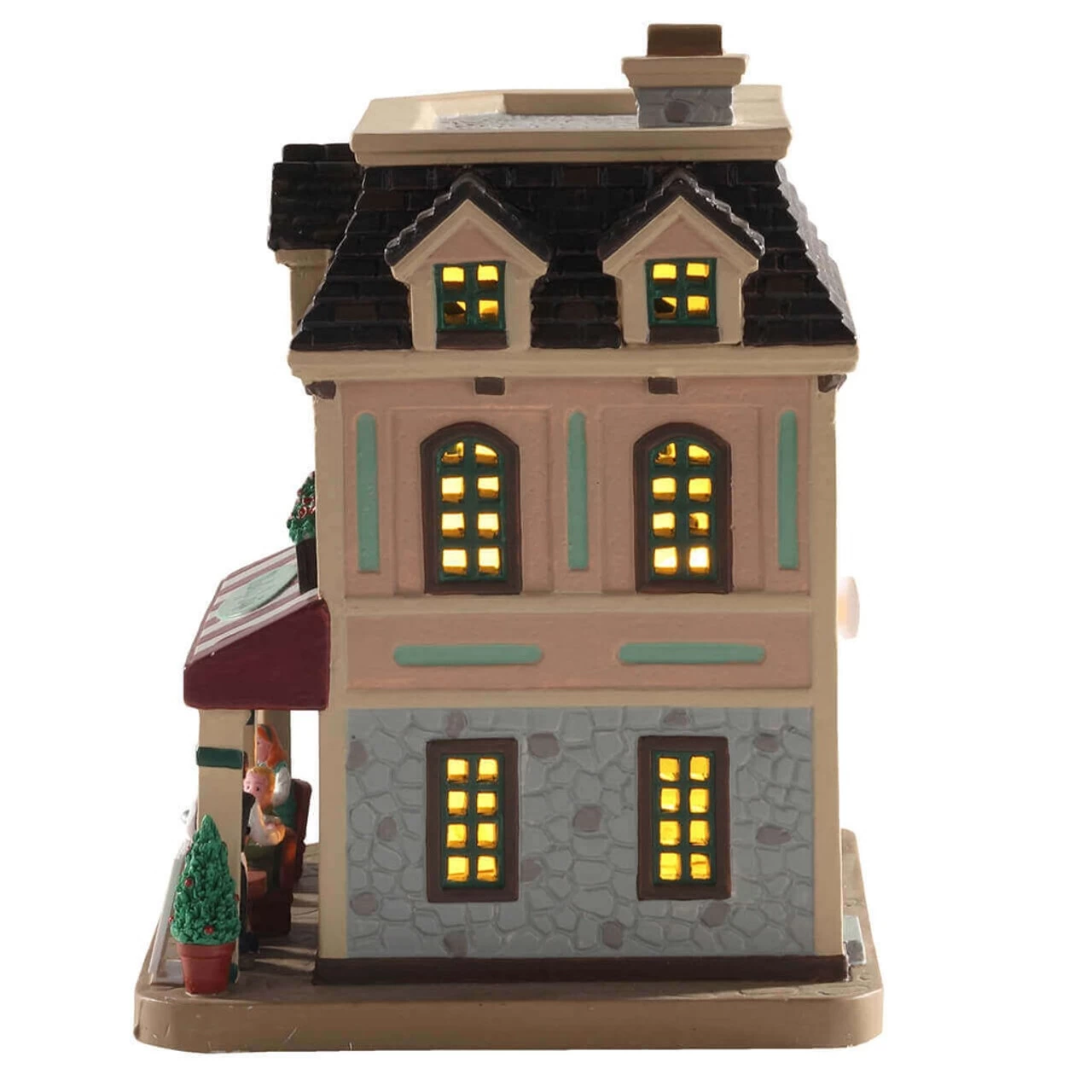 Molly’s Corner Café is a European-style building full of rustic charm. The top floor has windows decorated with flower boxes. Below, you have a red and white awning with signage for breakfast, lunch, and coffee. On the front terrace, you have two tables with patrons enjoying the delicious homemade meals, being served by a fancy waiter