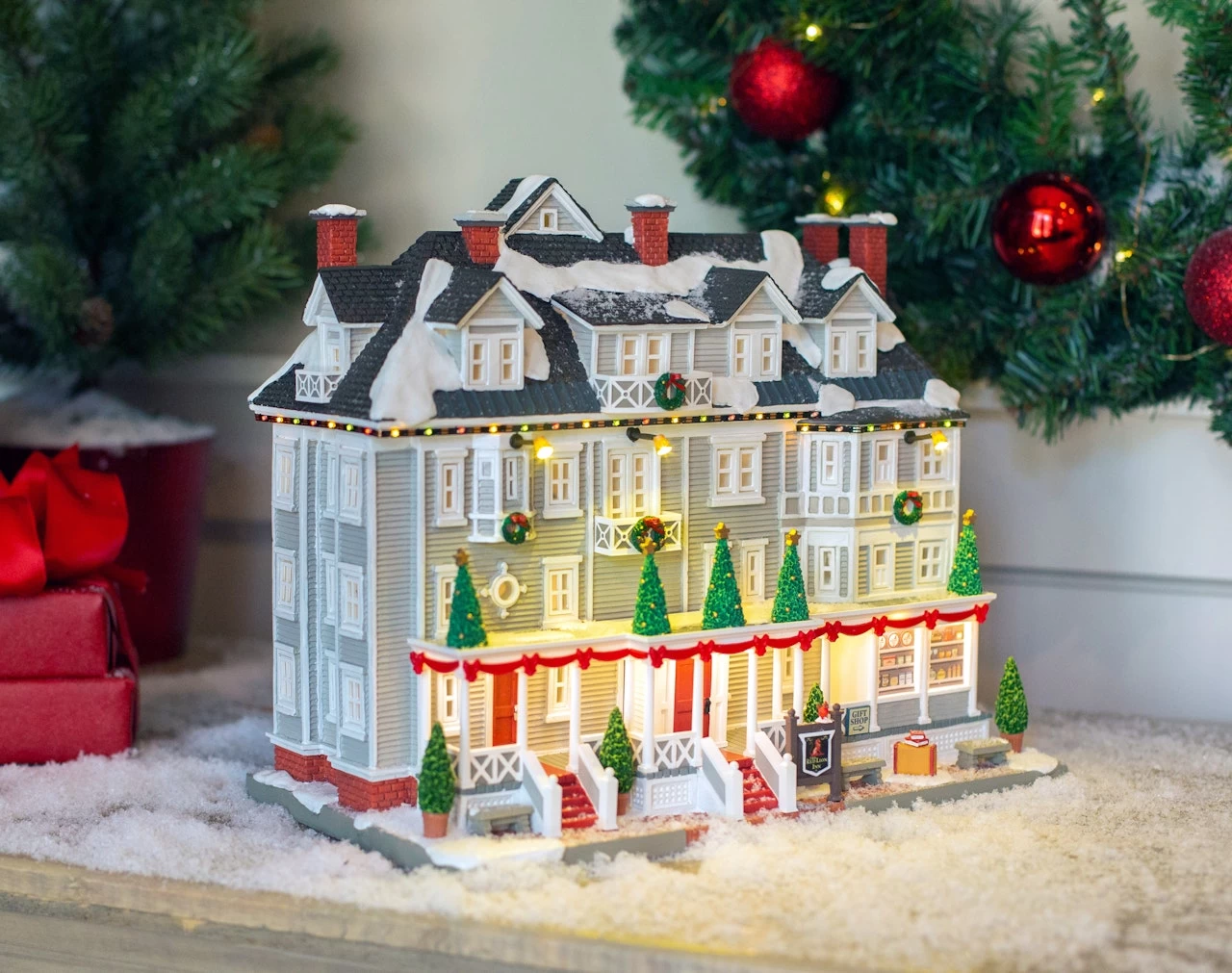 The Red Lion Inn is the heart of the town. Established in 1774 as a stagecoach stop, this beautiful white-paneled hotel features dozens of windows and charming red doors. Its awning is adorned with Christmas trees, wreaths, red ribbon, and lights. Through the storefront window, you can see the gift shop display, featuring collectible dishware, snacks, and other goodies. Luggage is waiting to be picked up on the front stoop—a sign that family is here for the holidays!
