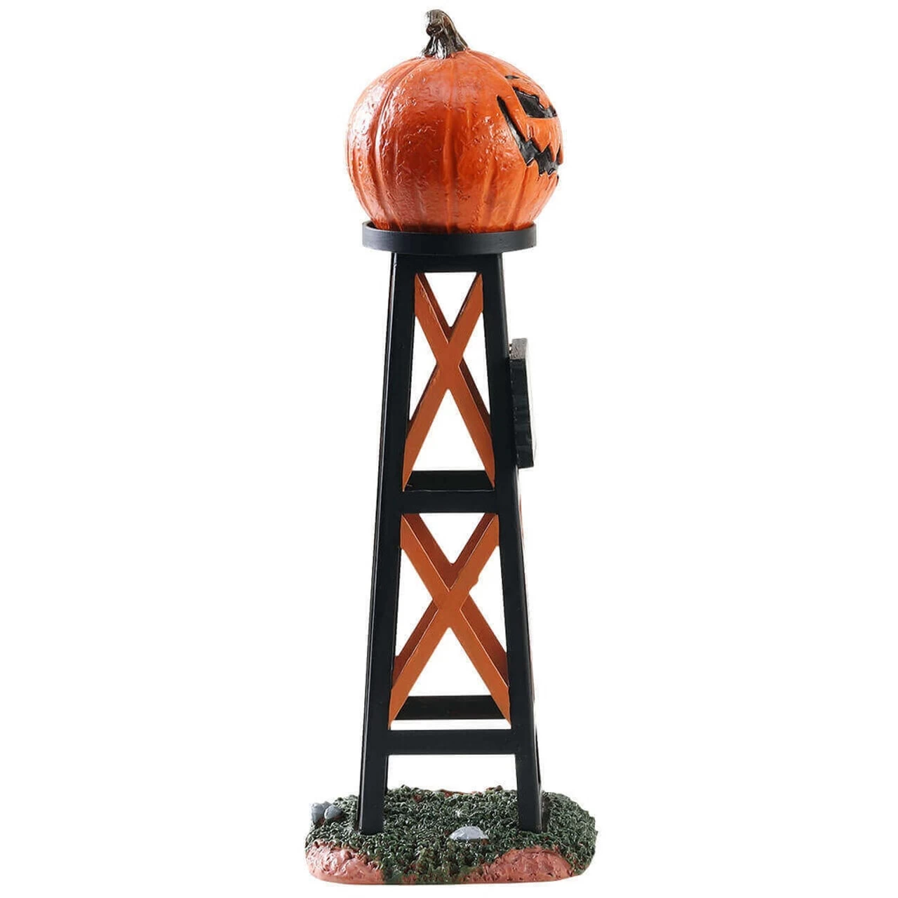 This item features a Jack O Lantern with an evil face as a water tower. Orange and Black create the supporting structure. This will be a great addition to your miniature scene.