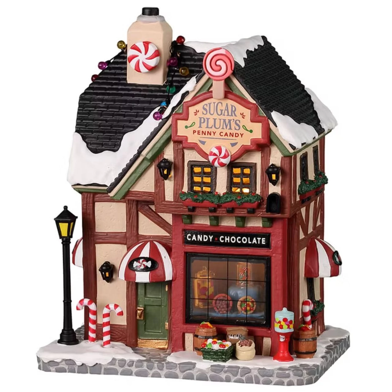 The Sugar Plum’s Penny Candy store is the number one place for the local kids in Caddington Village. It’s pretty popular with the adults with a sweet tooth too. Take a peek through the lit window at all of the delicious treats but beware, it’s sure to get your mouth watering! Decorated with fitting candy canes and a light dusting of snow on the roof, this is a perfect snapshot of Christmas in small-town America. Make sure to brush your teeth!