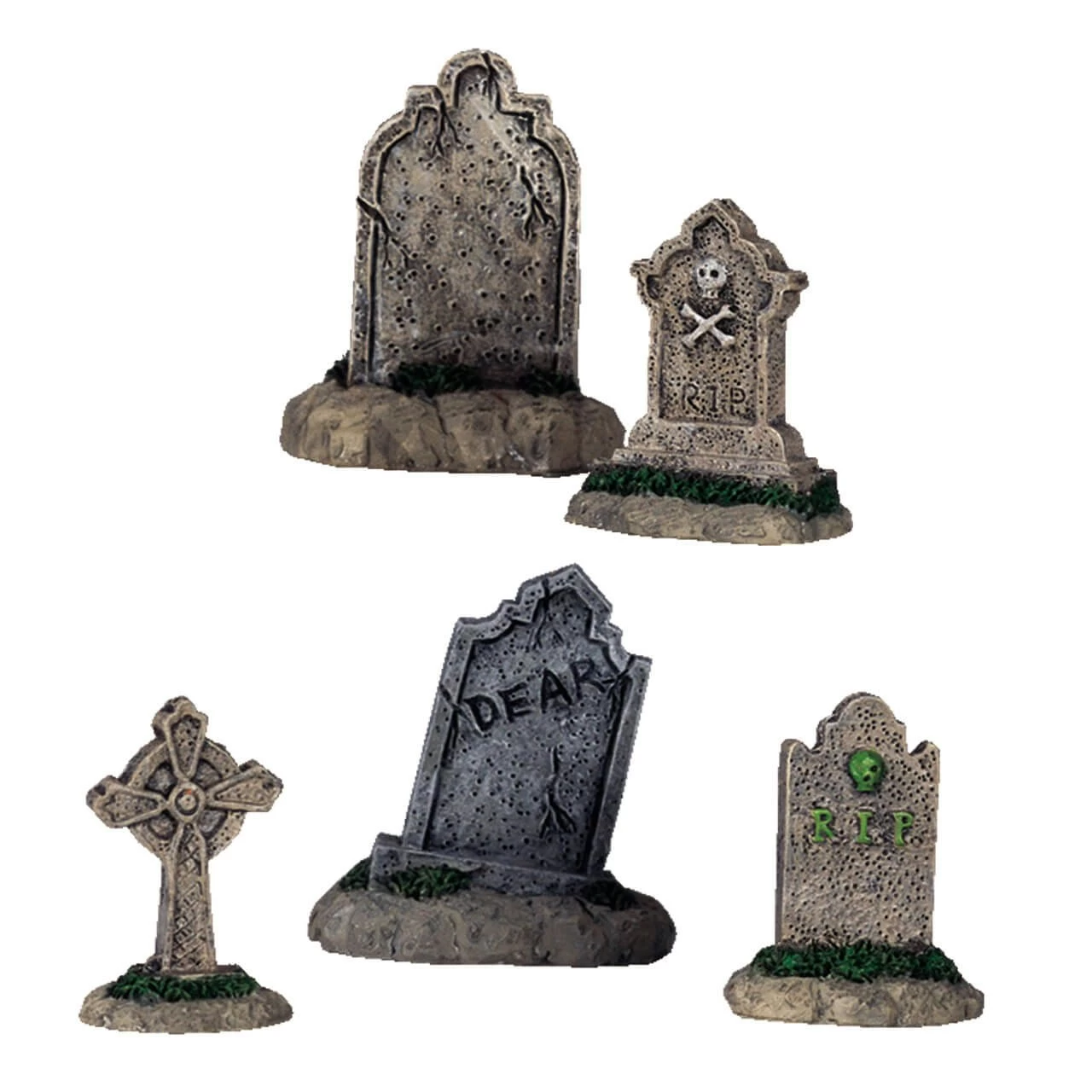 The tombstones are crafted to replicate aged and weathered headstones, featuring cracked surfaces, engravings, and mossy accents, heightening the creepy atmosphere. Here’s a closer look at each piece in the set: