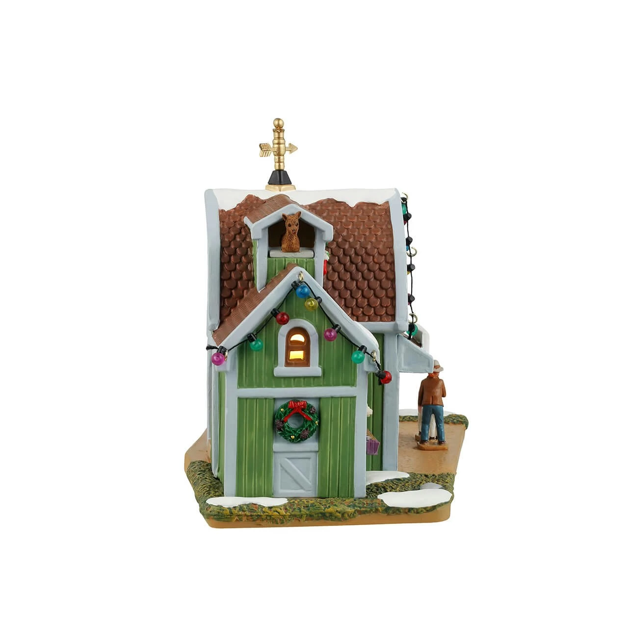 The building features a quaint green and white exterior, adorned with festive holiday wreaths and colorful Christmas lights that add a joyful touch. The roof is snow-capped, and a golden weather vane stands proudly at the top, completing the farm aesthetic.